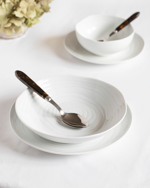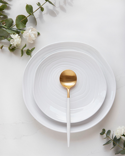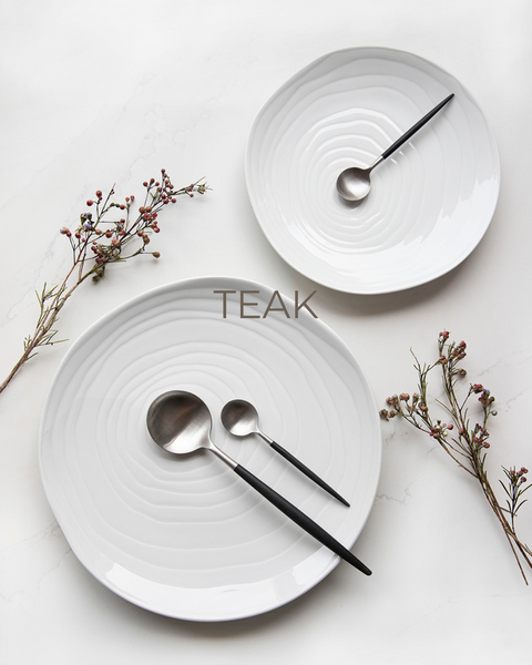 Design inspired by the cross-section of the teak tree trunk combines the organic shapes of the different pieces with unparalleled elegance. Handmade in one of the oldest porcelain tableware factories in France, it is a beautiful collection to dress up any moment at the table.