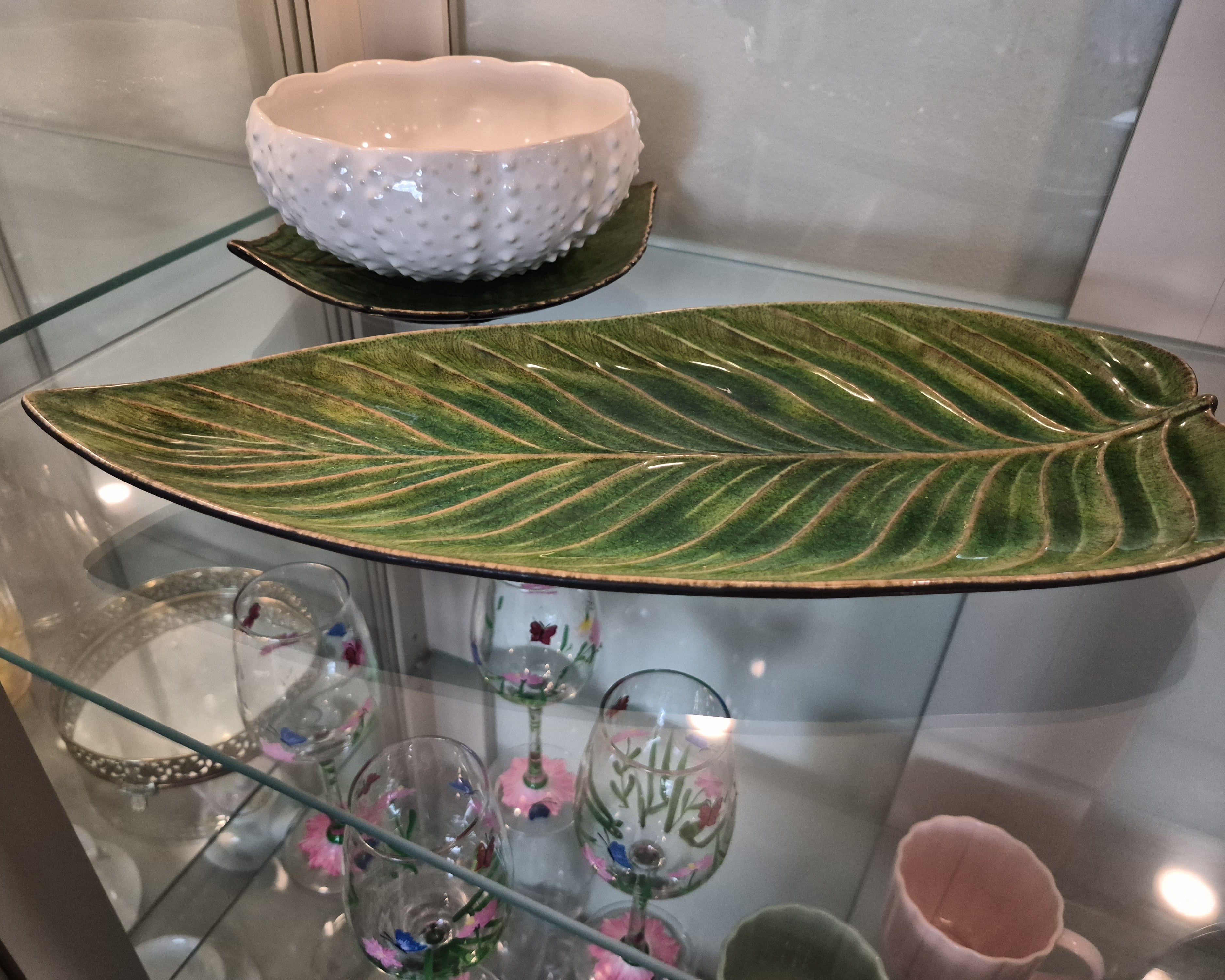 Preciosa fuente llana en forma de hoja de color verde de la colección Riviera Green. Ideal como plato para servir al centro platos principales o incluso pequeños aperitivos. Destaca su textura en relieve.