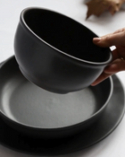 De complete set met Roda Ardosia servies. Elegante en tijdloze matzwarte producten. Gemaakt van fijn steengoed door Costa Nova in Portugal.